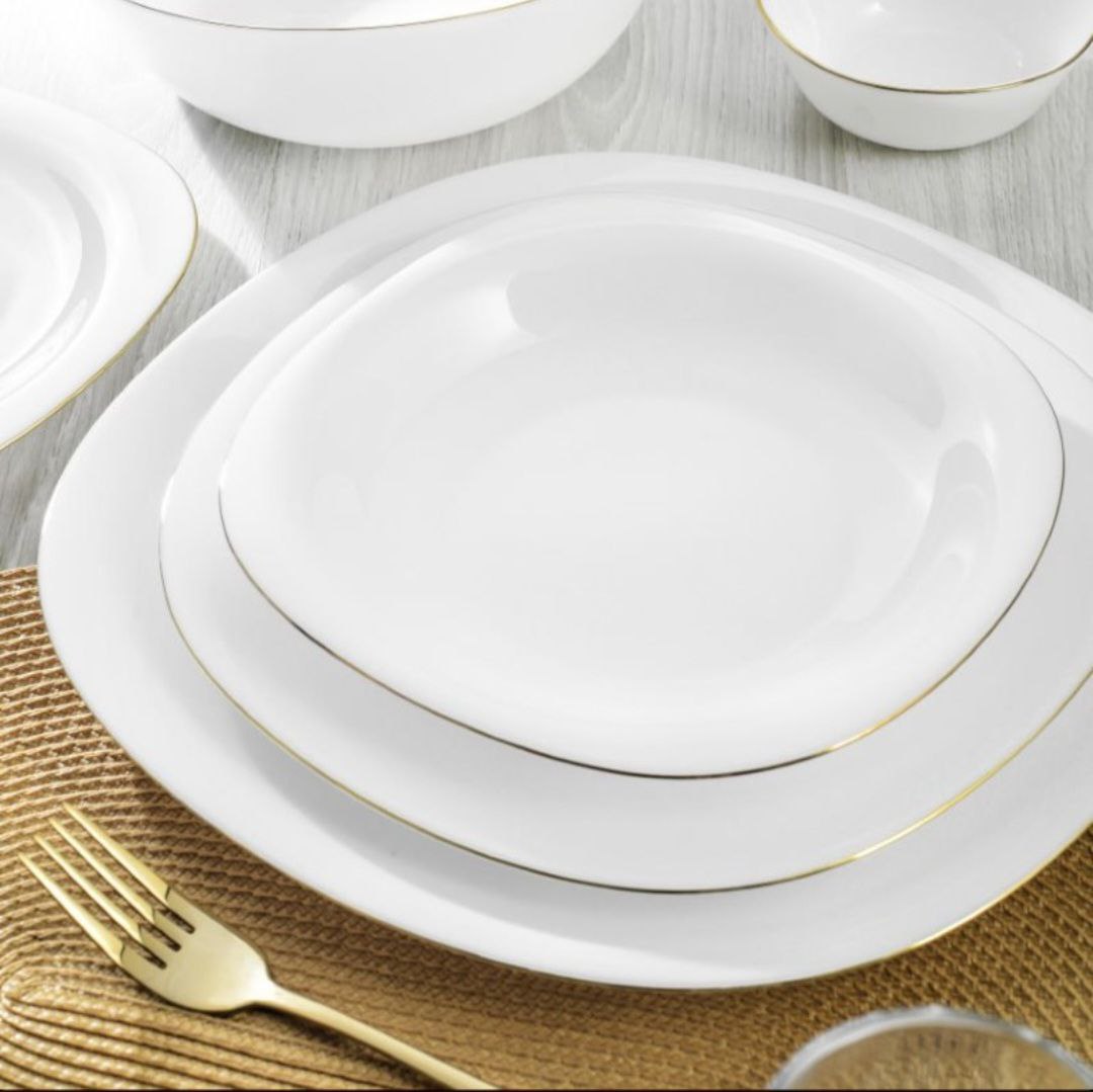قالب مربع این سرویس، با گوشههای نرم و لبههای طلایی، ترکیبی از هندسه مدرن و ظرافت کلاسیک را به نمایش میگذارد. رنگ سفید خالص زمینهای عالی برای درخشش طلای دور ظروف فراهم کرده است.