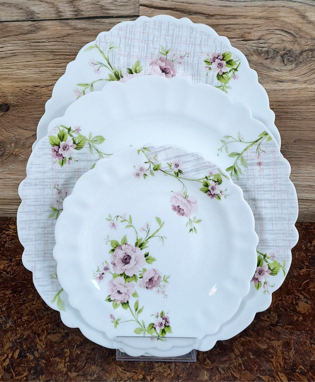 طرح گلهای صورتی با ظرافتی خاص روی زمینه سفید نقش بستهاند و حس لطافت، زیبایی و آرامش را به سفره شما میآورد. این طراحی مخصوص کسانی است که به جزئیات ظریف و رنگهای ملایم اهمیت میدهند. فرم ظروف نیز بهگونهای طراحی شده تا با سادگی و وقار، جلوهای خاص به میز غذاخوری ببخشد.