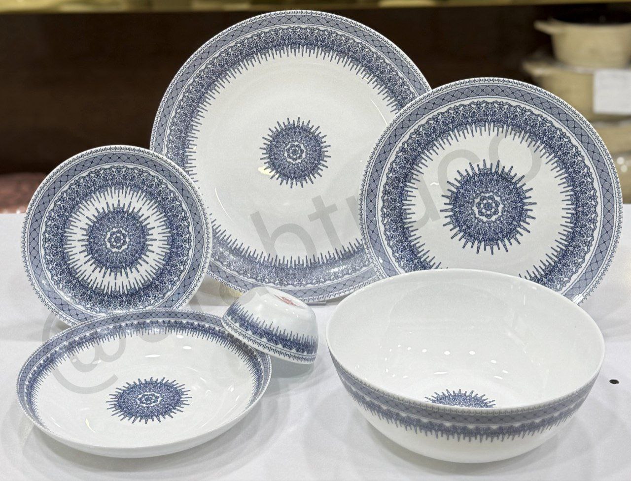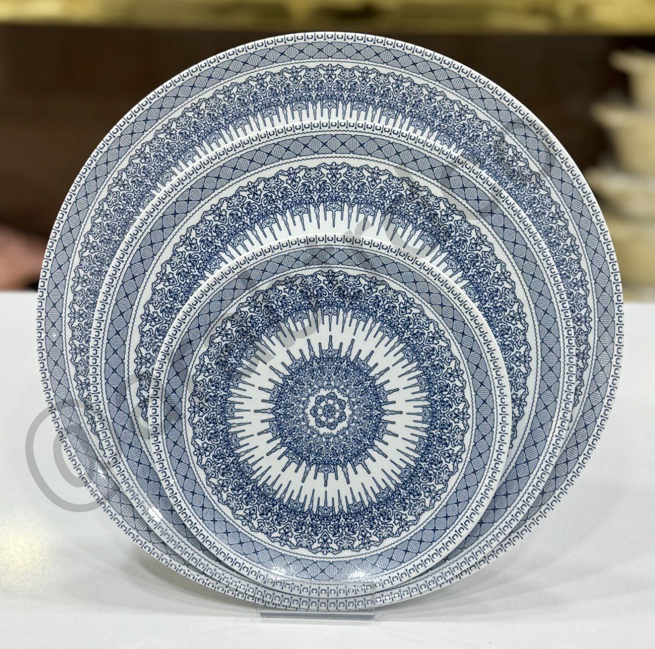 طرح رجینا سرمهای با نقوش ظریف به رنگ سرمهای تیره روی زمینه سفید، تضادی چشمگیر و دلنشین ایجاد کرده است. این رنگ عمیق و شیک به راحتی با ظروف دیگر و اکسسوریهای پذیرایی هماهنگ میشود و جلوهای رسمی و خاص به میز غذا میدهد.